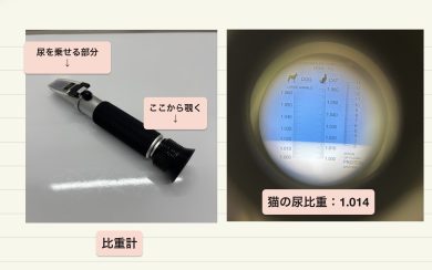 猫の尿比重の基準値は約1.035-1.060と決まっているので基準に入っているのか、逸脱しているのかを判定します。