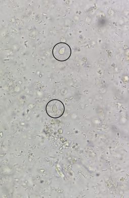 糞便検査を行い、顕微鏡上でトリコモナスが観察されると確定診断となります。排泄してからすぐの便ではトリコモナスがクルクルと動いている様子が観察できます。
