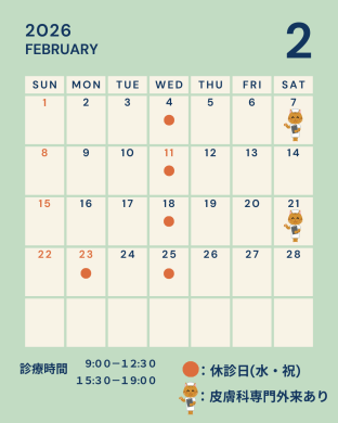 2月の診療日と皮膚科専門外来のお知らせ 2026.1.29 お知らせ こんにちは!武蔵野市、三鷹市、小金井市、調布市、西東京市地域の皆様こんにちは!武蔵境駅徒歩6分に位置する武蔵野まりん動物病院です。2月も水曜日と祝日以外はいつも通り、午前が9:00-12:30、午後が15:30-19:00で診療を行います!また、当院では、日本獣医皮膚科学会認定医の伊藤直之先生をお招きして、月に2回皮膚科専門外来を行っています。来月の日時は2月7日(土)、2月21日(土)いずれも9:00-19:00です。完全予約制のため、2日前までにお電話、もしくは受付にてご予約ください。 前へ 一覧へ戻る 次へ
