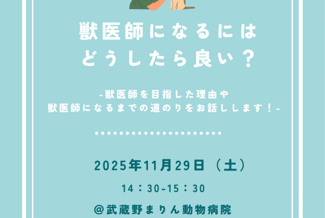 2025.11.7 お知らせ プチイベントを開催します!【獣医師になるにはどうしたら良い?】 詳しく見る 2025.11.2 お知らせ 日中・夜間の救急診療について【武蔵野・三鷹・小金井・調布・西東京地域の皆様】 詳しく見る